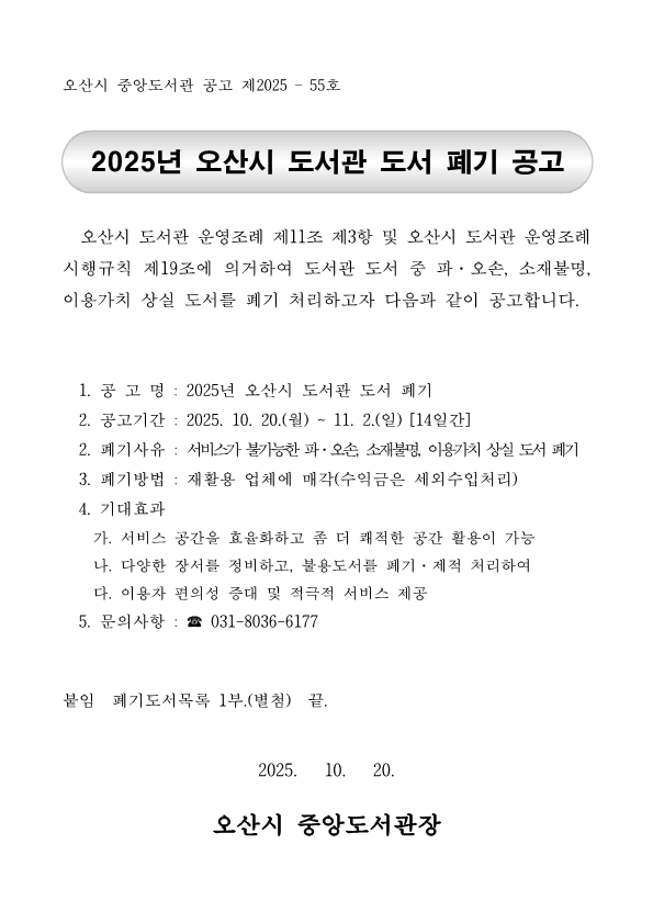 2025년 오산시 도서관 기간제근로자(소리울 연중무휴) 채용 서류전형결과 및 면접시험 계획 공지