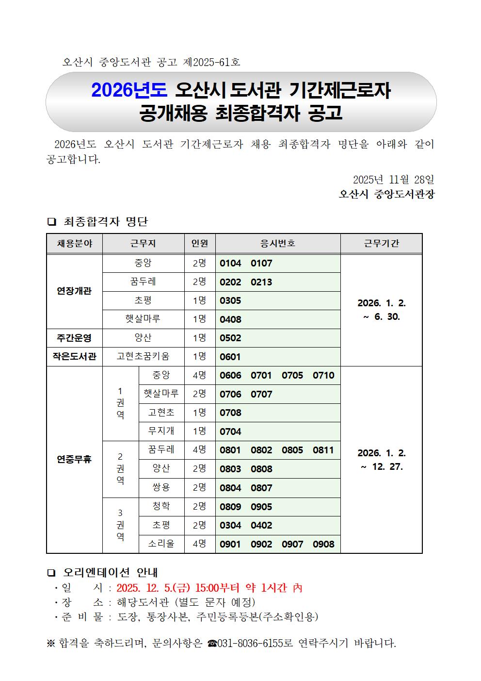 2026년도 오산시도서관 기간제근로자 공개채용 최종합격자 공고(연장개관, 주간운영, 작은도서관, 연중무휴)